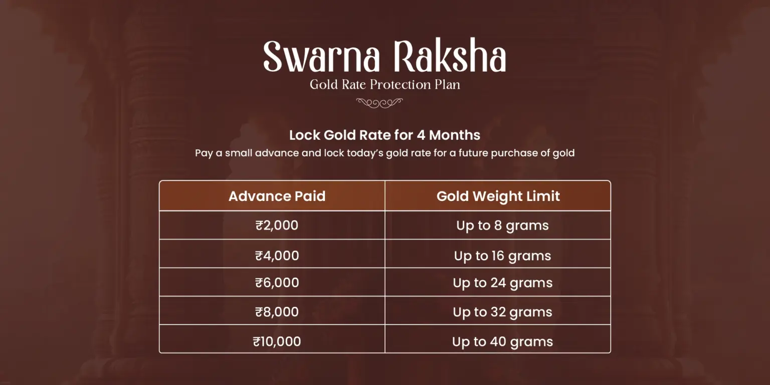 Swarna Raksha is a simple and transparent jewellery purchase plan for those who want to plan their gold buying in advance. When you make your purchase, you get the benefit of paying either the booked gold rate or the prevailing gold rate – whichever is lower.