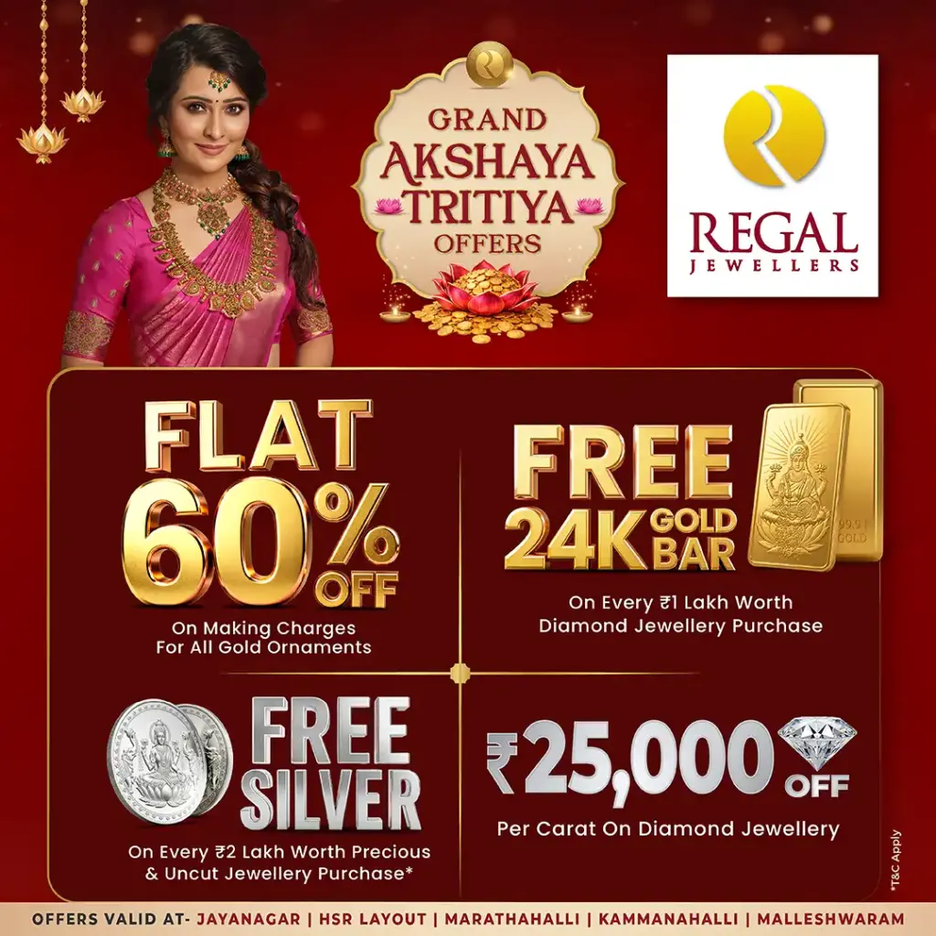 Celebrate with 60% off on gold making charges, free 24K gold bar on ₹1 lakh diamond purchase, ₹25,000 off per carat, and get free silver on ₹2 lakh purchases.