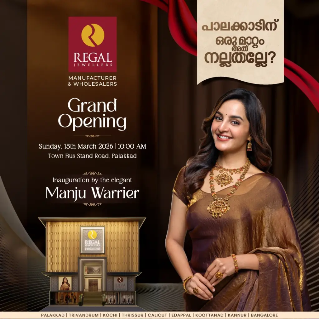 The showroom will be inaugurated by Manju Warrier on 15th March at 10:00 AM, marking a grand beginning for Regal Jewellers in the city.