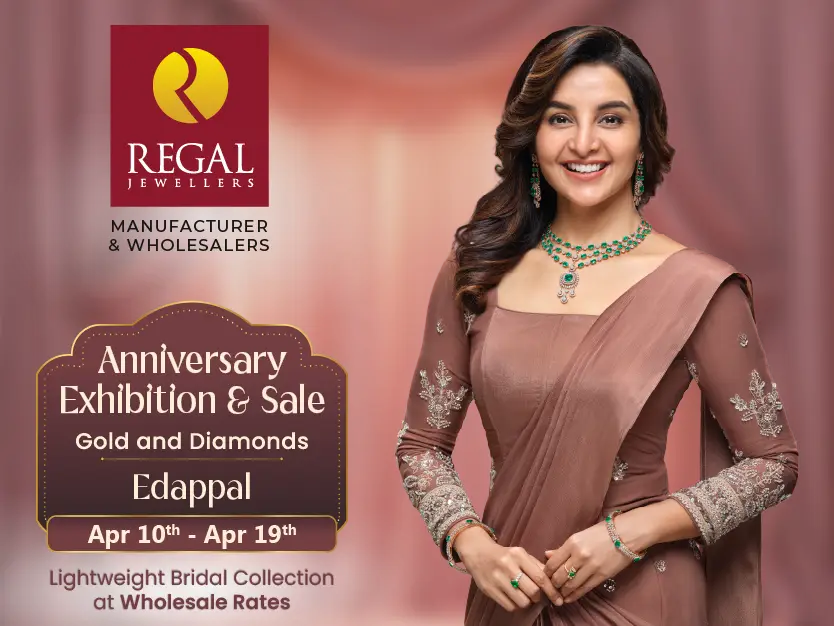 Regal Jewellers Edappal presents its Anniversary Exhibition & Sale from April 10th to April 19th, 2026, bringing exclusive gold and diamond jewellery offers in Edappal. Known for true wholesale value and exceptional craftsmanship, Regal Jewellers continues to be a trusted destination for jewellery shopping in Kerala.